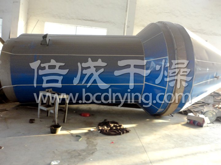本機組工作過程為料液通過隔膜泵高壓輸入,噴出霧狀液滴,然后同熱空氣并流下降,大部分粉粒由塔底排料口收集,廢氣及其微小粉末經(jīng)旋風(fēng)分離器分離,廢氣由抽風(fēng)機排出,粉末由設(shè)在旋風(fēng)分離器下端的授粉筒收集,風(fēng)機出口還可裝備二級除塵裝置,回收率在96-98%以上。