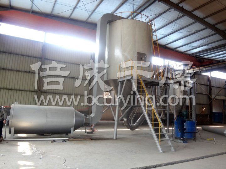 空氣經(jīng)過濾和加熱,進入干燥器頂部空氣分配器,熱空氣呈螺旋狀均勻地進入干燥室。料液經(jīng)塔體頂部的高速離心霧化器,(旋轉(zhuǎn))噴霧成極細(xì)微的霧狀液珠,與熱空氣并流接觸在極短的時間內(nèi)可干燥為成品。成品連續(xù)地由干燥塔底部和旋風(fēng)分離器中輸出,廢氣由風(fēng)機排空。