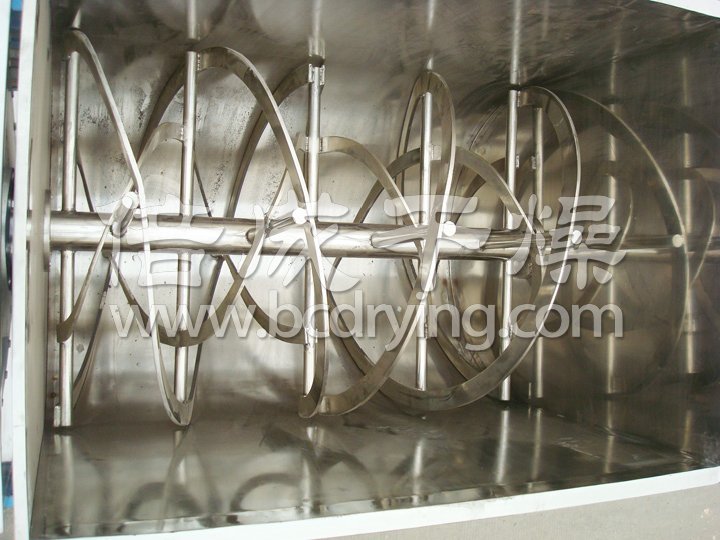 該機型由容器、螺旋攪拌葉片和傳動部件組成:螺旋葉片一般做成雙層或三層,外層螺旋將物料從兩側向中央匯集,內層螺旋將物料從中央兩側輸送,形成對流混合。